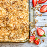 Place unsweetened coconut flakes on a sheet pan and put it in the oven. Toast the flakes until they turn light golden brown, and be sure to immediately remove the pan from the oven as coconut can burn easily if left in too long. Sprinkle the top of the cake with the toasted coconut. You can even decorate the top with some toasted almonds or fresh fruit. We like to use strawberries, but it can be anything you desire!